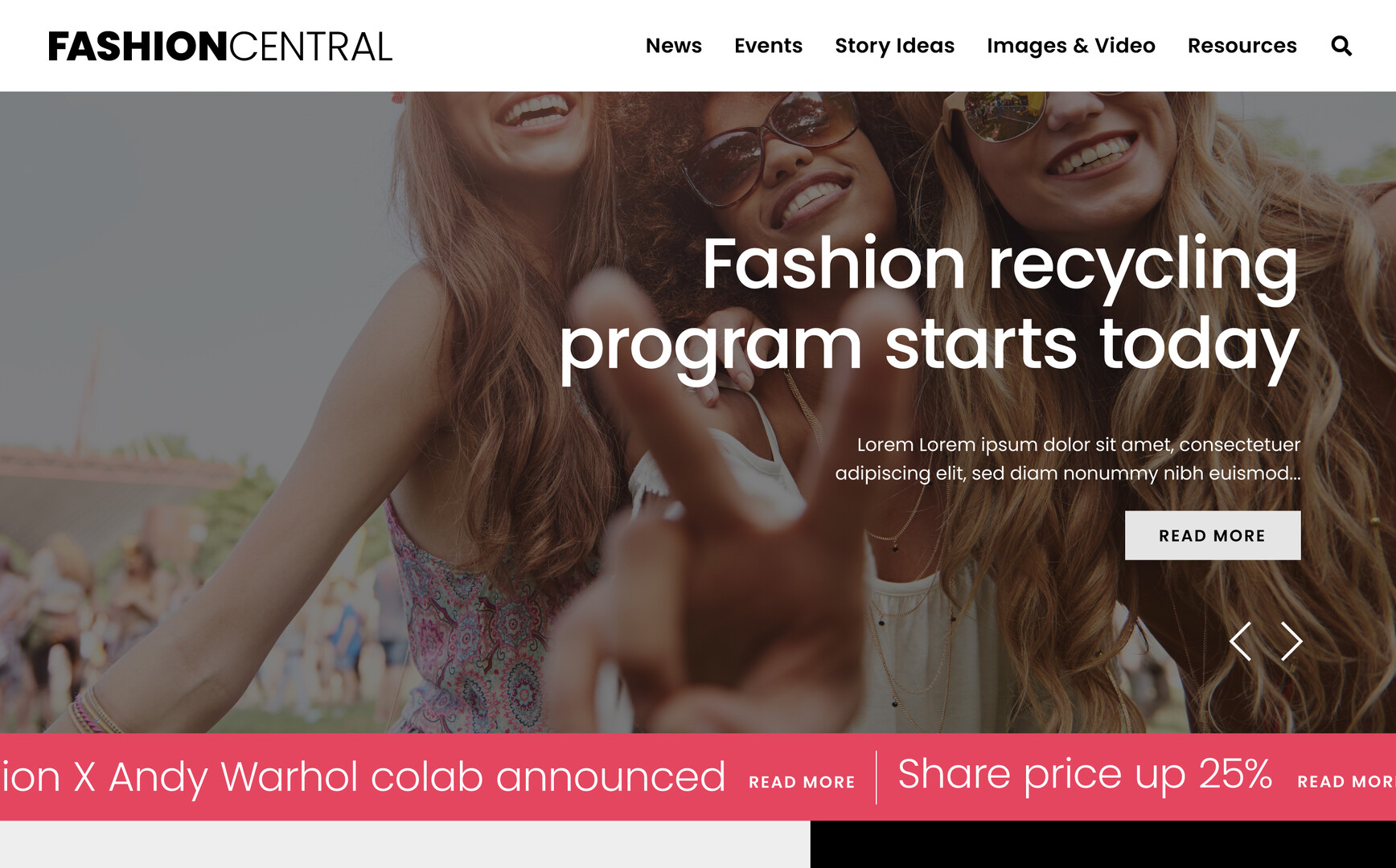 A colorful website banner displays a vibrant outdoor scene, with two smiling individuals wearing sunglasses, promoting a fashion recycling program. Text highlights the launch of the initiative, alongside announcements about a collaboration with Andy