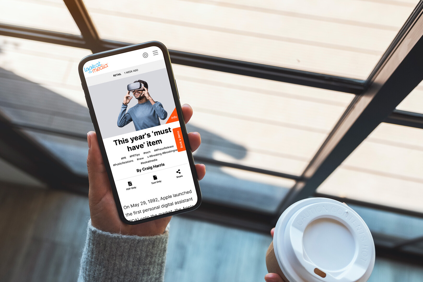 A person holds a smartphone displaying an article about digital marketing trends. A coffee cup sits nearby on the table. Sunlight streams through large windows, illuminating the space, which appears to be a modern interior setting. The scene suggests
