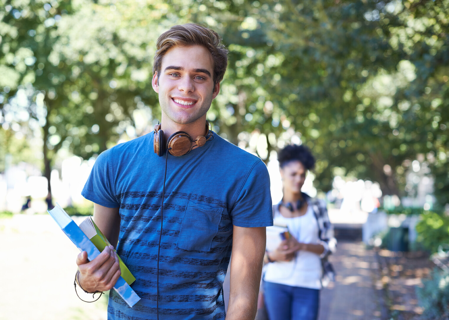 A young man carrying books walks along a tree-lined path, wearing headphones and a blue shirt. Behind him, another individual appears to be checking a phone, also wearing headphones. The scene takes place in a park-like setting with sunlight filterin