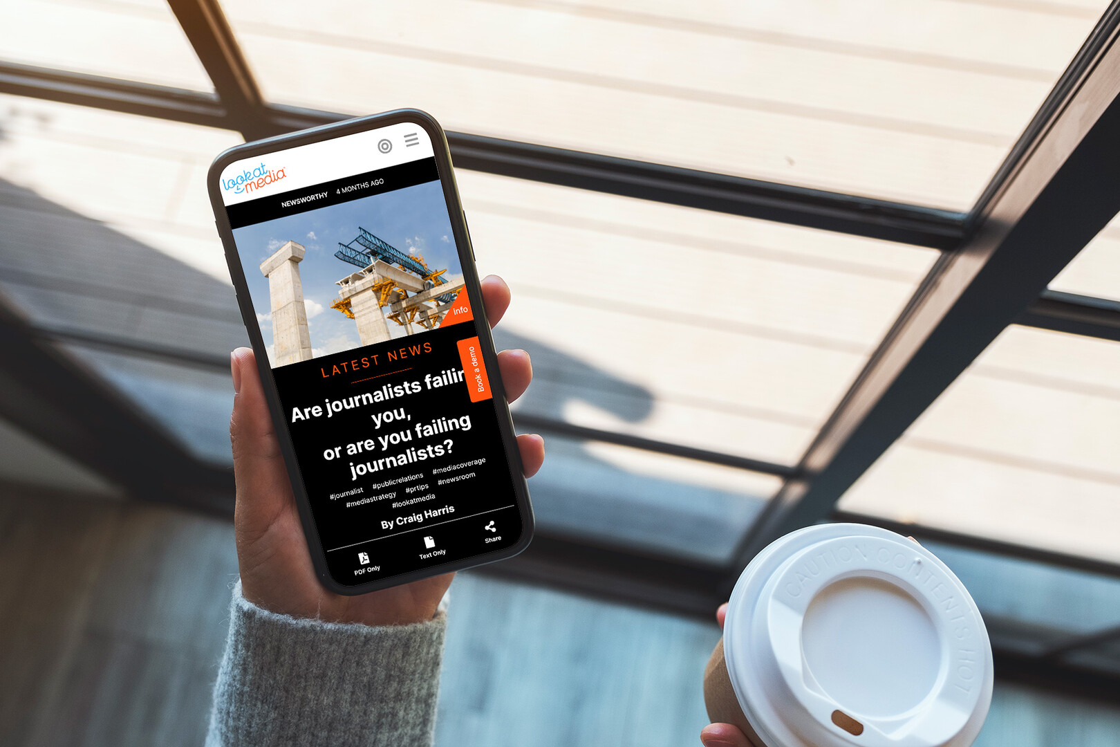 A person holds a smartphone displaying a news website featuring an article with the headline "Are journalists failing you, or are you trusting journalists?" A disposable coffee cup is seen in the other hand. The scene appears to be set indoors, with
