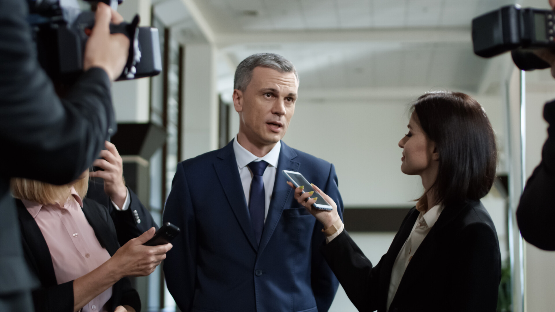 A man in a suit stands at a podium surrounded by reporters holding microphones and smartphones. The scene takes place in a modern indoor setting with large windows and neutral-colored decor. A woman asks a question, while others focus on their device